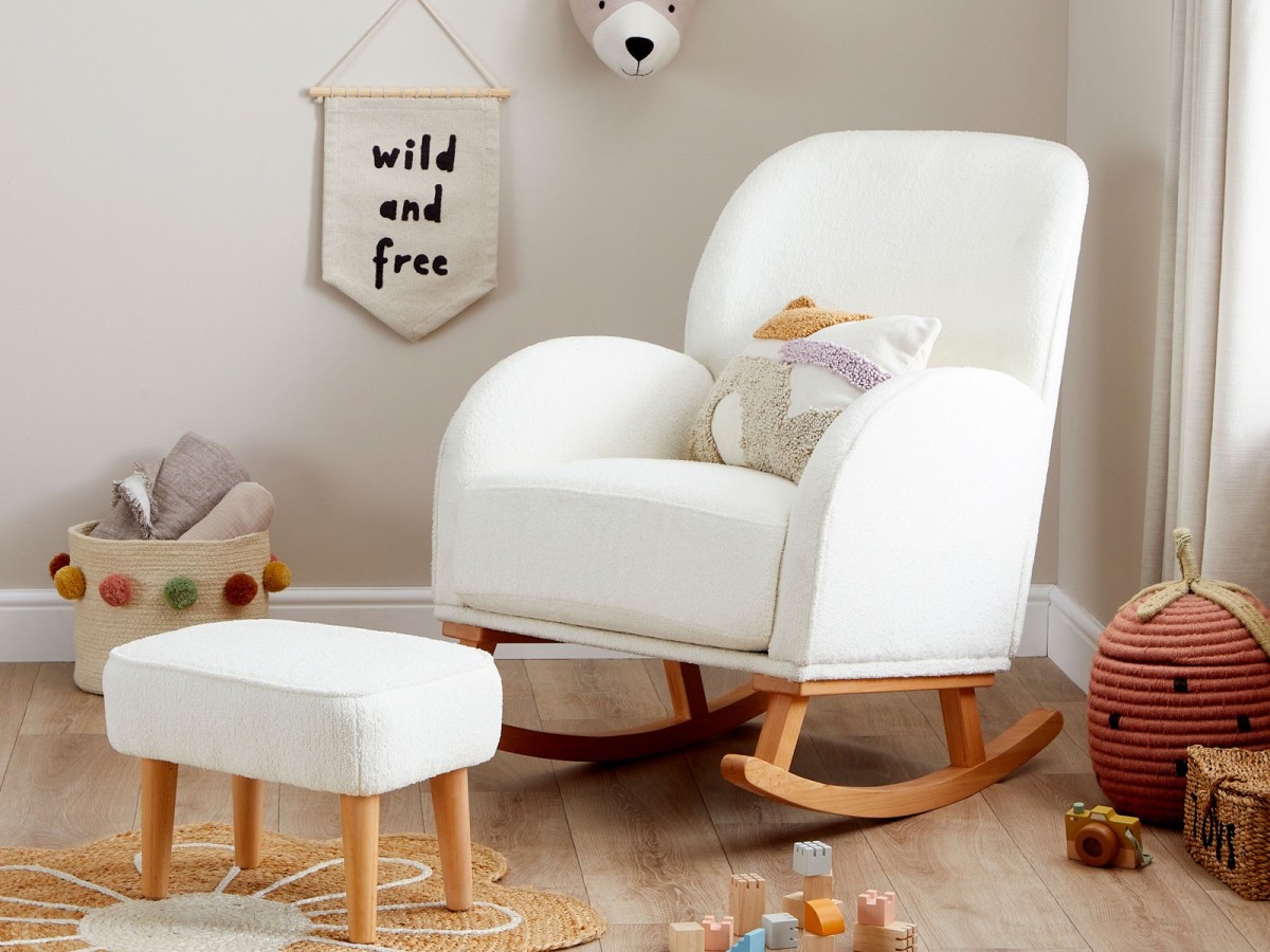 The Babymore Freya Nursing Chair is the perfect choice for nurturing moments with your little one. The smooth gentle rocking motion and supportive contoured backrest allow you to relax in your baby’s nursery whilst feeding your precious bundle. The supportive armrests provide additional comfort as baby drifts off to sleep. Matching footstool included for those tired legs. Available in three neutral colours - Cream, Grey and Off White Bouclé - perfectly complementing any nursery setting.