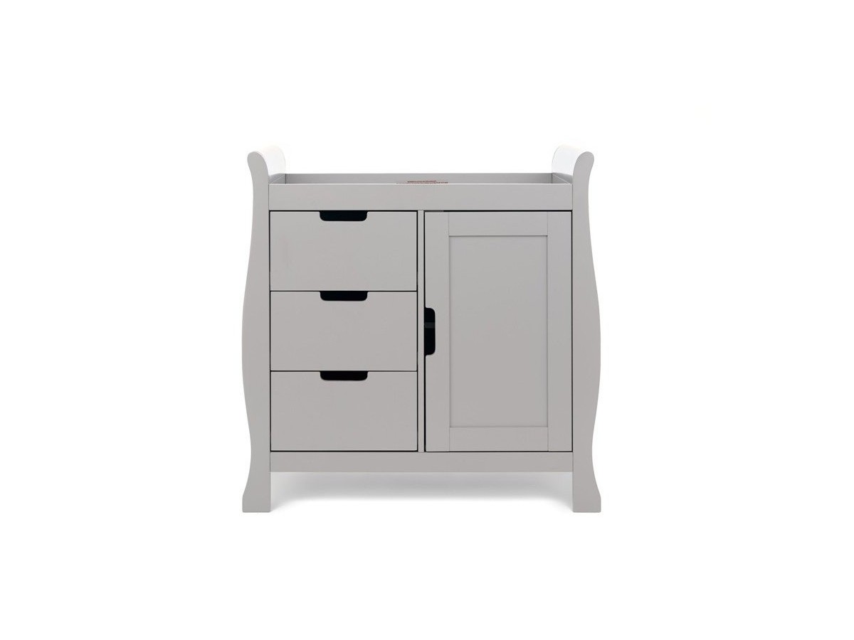 This beautiful closed changing unit features the same elegant sleigh design that flows through the rest of the Stamford range. Sleek lines and recessed handles create a stylish and uncluttered look, whilst ensuring it is simple to use. Its combination of three spacious 13L capacity drawers and full height cupboard with adjustable shelf and soft close door provide plenty of storage options for little one’s precious belongings, whilst the cleverly recessed section on the top of the changing unit perfectly accommodates a changing mat up to 76 x 46cm.