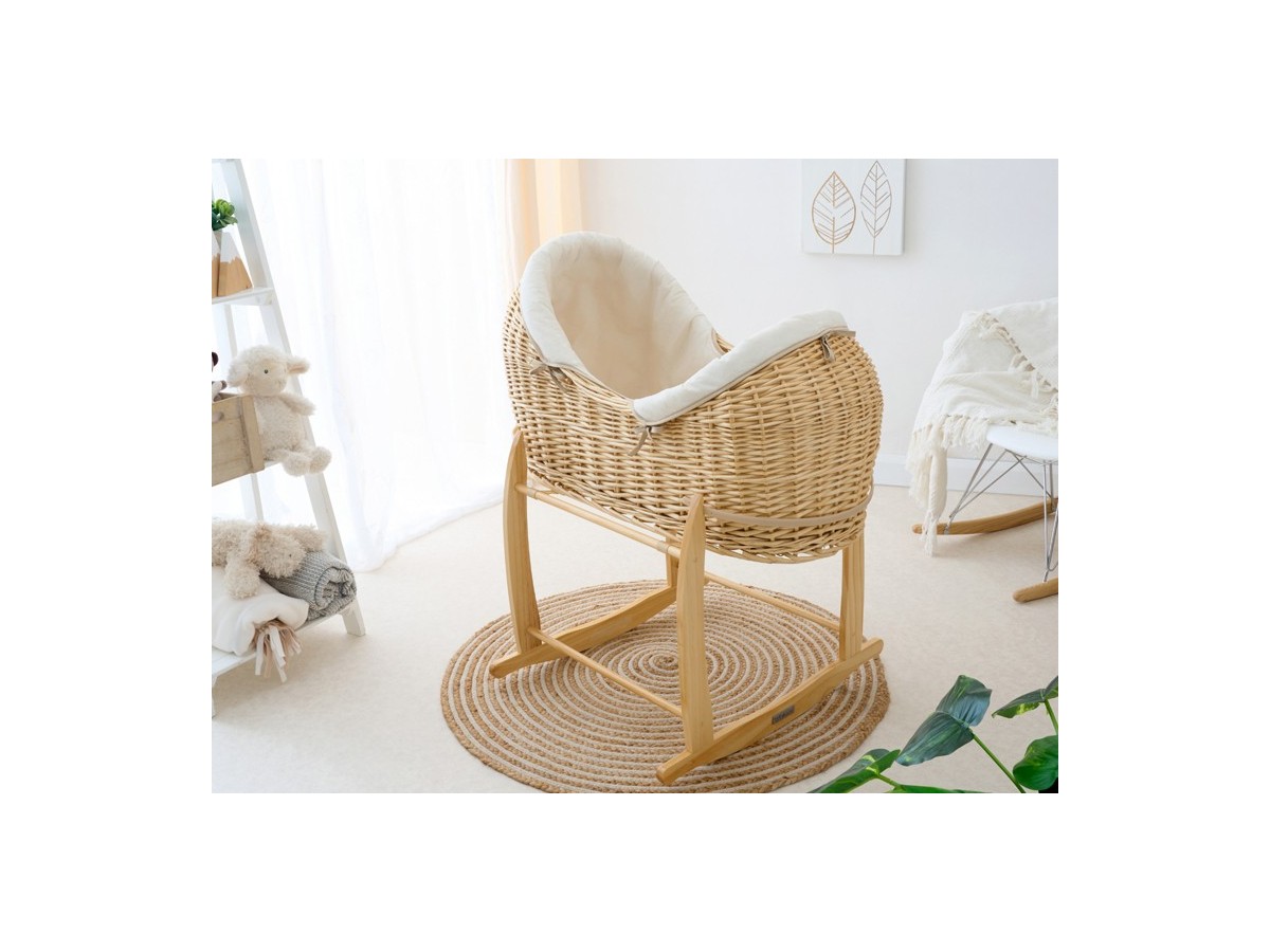 This premium adaptation of a traditional Moses basket is hand-woven from sturdy willow-wicker and hand-dressed by our wonderful team in our Sedex-certified British factory. The luxury organic dressing features a sewn-in padded lining which protects the wicker basket internally and externally, for both baby and carrier comfort.