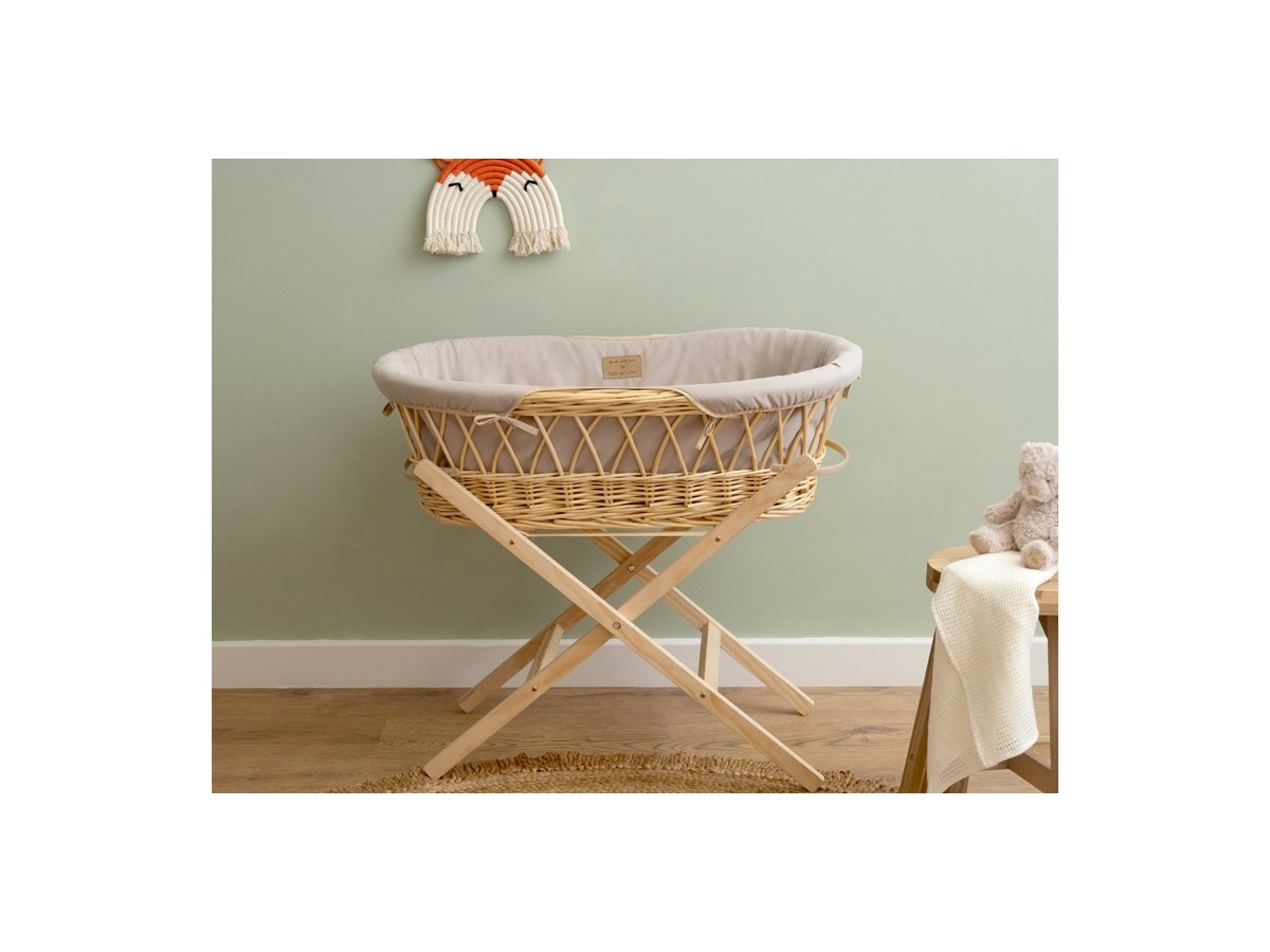Comes with a naturally varnished wicker Moses basket, thick padded organic dressing, cream sheet and a firm natural bamboo mattress.