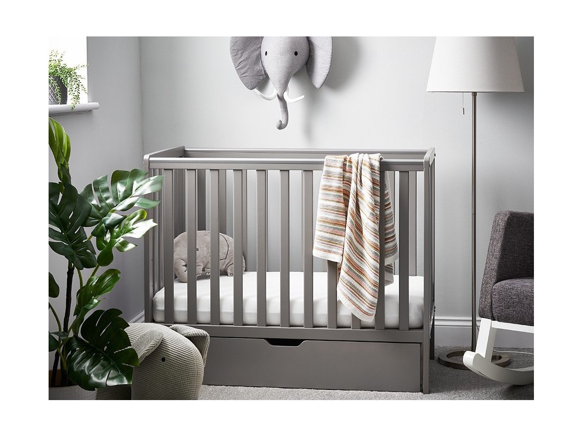 This space saver cot features protective teething rails, a fully open slatted design meaning you can keep an eye on your little one at all times and a three-position adjustable mattress base to ensure your little one is safe and secure from birth to toddler age.