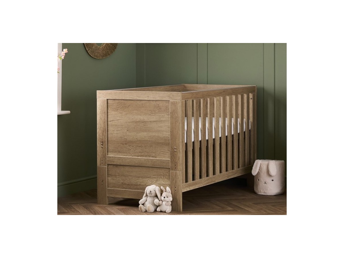 With its oak finish and modern design, this stylish cot bed is more than just a safe sleeping space; it grows with your child from birth to approximately four years old.
