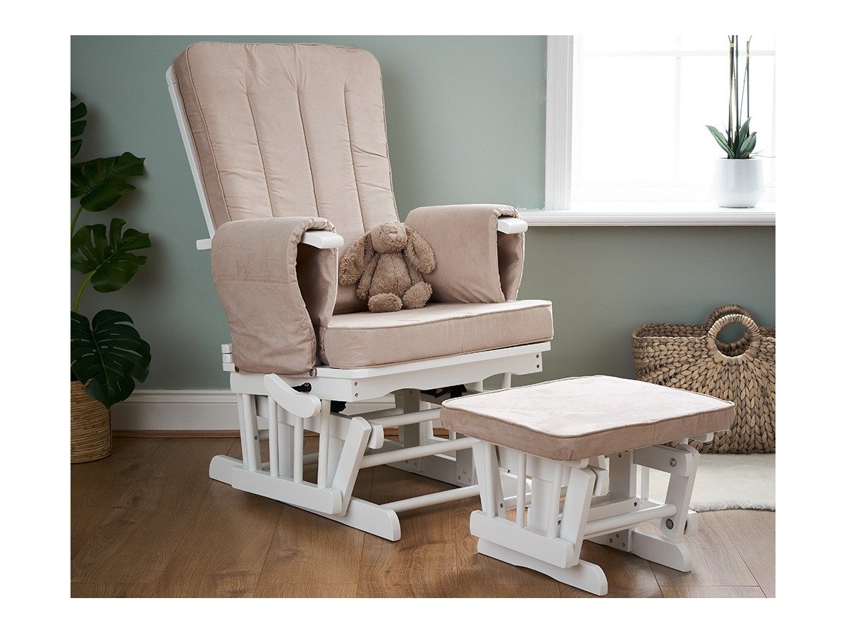The extra thick, luxuriously padded back and seat cushions ensure you never want to leave and the padded arm rests each feature a handy storage pocket to keep any important items close to hand. By simply lifting the arm ends, the backrest angle can be effortlessly adjusted with an impressive seven positions, ensuring you can always find the perfect seating position. The beautifully constructed wooden frame and square back show off the traditional design while the soft neutral tones of the cushions make sure that the chair and stool will coordinate perfectly in any nursery. When you are finished relaxing, a conveniently located gliding lock handle means you can make the chair static in any stage of its glide.