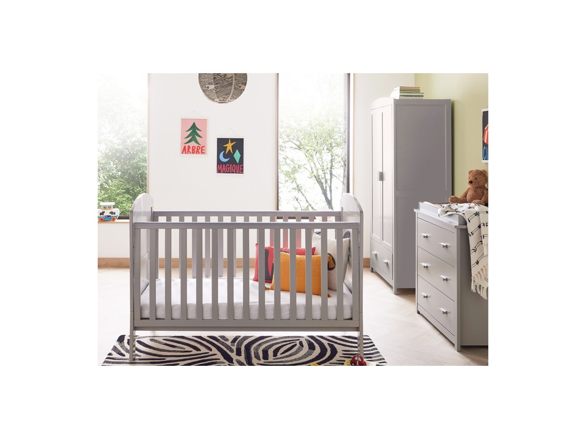 Introducing the Aston three-piece room set, which includes a beautiful dropside cot bed as well as a practical chest changer and spacious wardrobe.