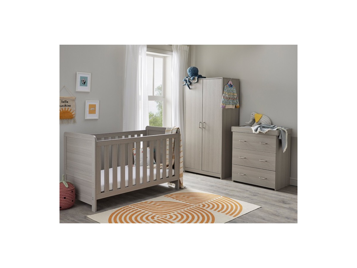 The Caro nursery collection is the ideal starting point for your nursery decor thanks to its timeless style and woodgrain finish. A stylish cot bed, versatile dresser, and double wardrobe are included in our Caro 3-piece nursery set. This cot will easily last through the first five years of your child's life thanks to its three height settings and ability to be transformed into a toddler bed. The dresser's changing top is detachable, transforming it from a practical baby changing unit into a chic dresser for displaying your child's treasured possessions. Finally, the double wardrobe is spacious enough to house your little one’s clothing with a shelf and the choice of either one or two rails.