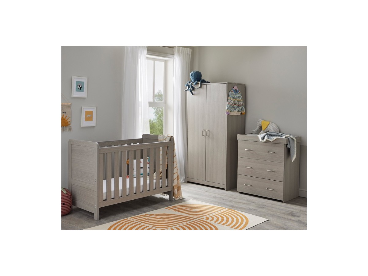 The Caro nursery collection is the ideal starting point for your nursery decor thanks to its timeless style and woodgrain finish. A stylish mini cot bed, versatile dresser, and double wardrobe are included in our Caro Mini 3-piece nursery set. This mini cot will easily last through the first four years of your child's life. Even though the Caro Mini Cot Bed is slightly smaller than the Caro Cot Bed, it has all the same great features. The mini cot bed has 3 mattress positions, teething rails on both sides, and you can easily convert it into a toddler bed. The dresser's changing top is detachable, transforming it from a practical baby changing unit into a chic dresser for displaying your child's treasured possessions. Finally, the double wardrobe is spacious enough to house your little one’s clothing with a shelf and the choice of either one or two rails.