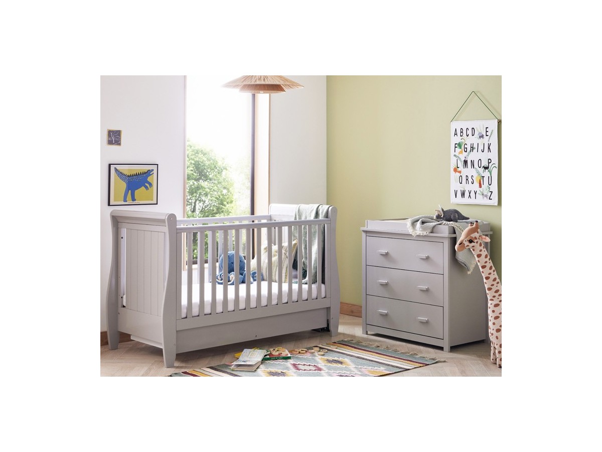 Babymore's 2-piece Stella nursery room set, which includes a stylish sleigh cot bed and a convenient chest changer, perfect for your little one's bedroom.