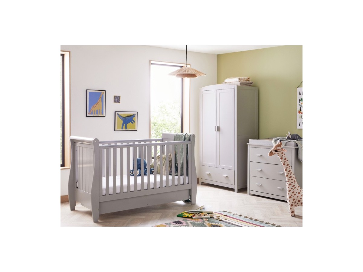 Babymore Stella three-piece room set, which includes a stunning sleigh cot bed. Everything you need to design a stylish and comfortable nursery for your child is included in this lovely set.