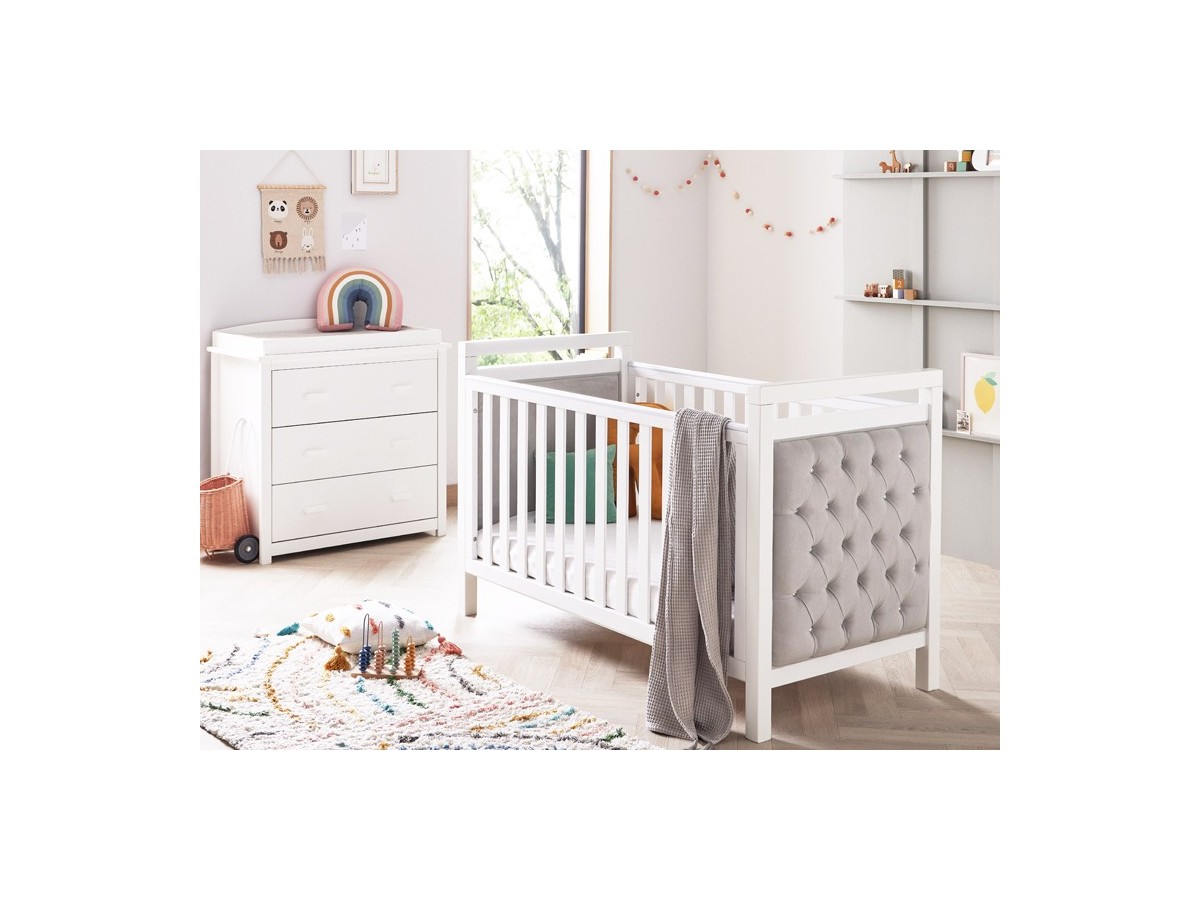 Crafted from the highest quality materials, our furniture set is designed to last for years to come. The centrepiece of the set is our luxurious velvet cot bed with diamante button detailing. The cot bed is expertly upholstered in velvet fabric, giving it a look and feel that is truly one-of-a-kind. There are 3 mattress positions which get lower as your baby gets older and more mobile. Once they outgrow the cot, it can easily be transformed into a stylish toddler bed.