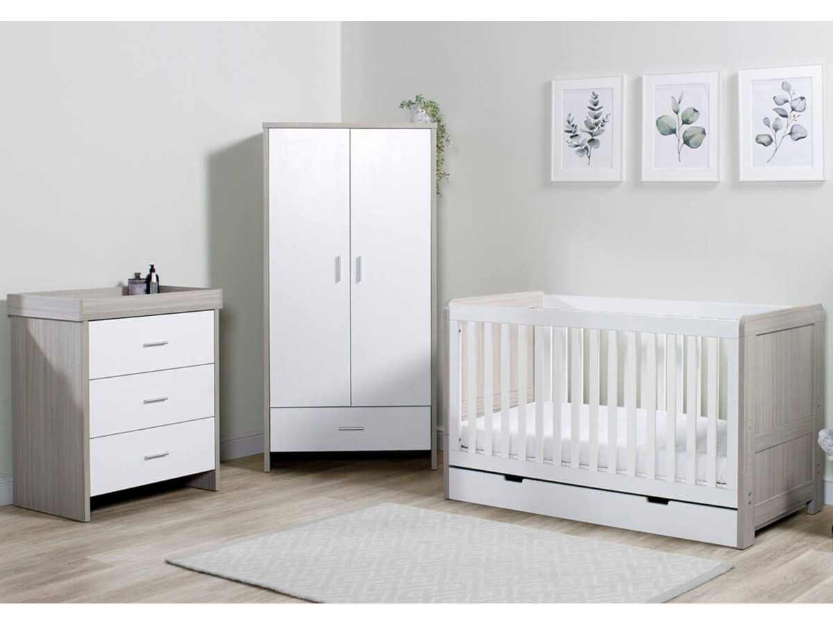 The Pembrey 3 Piece Set and under drawer includes cot bed, changing unit, wardrobe and under drawer. Whatever your personal style The Pembrey Furniture Collection has an option to suit you. Available in 3 different colour options, offering you a choice of a full textured oak design or alternatives that include contemporary white detailing.