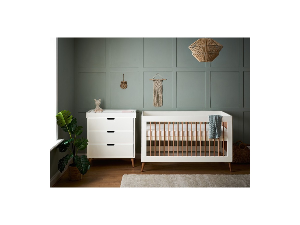 The Maya from Obaby is inspired by Scandinavian design, featuring a clean-cut finish and two-tone colourway. The Maya 2 piece room set consists of the Maya cot bed and changing unit.