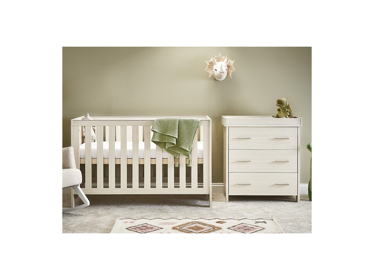 "The Obaby Nika range offers a contemporary design, due to its clean lines and textured oak effect finish, that will fit perfectly in today’s modern nursery. This 2 piece room set consists of Nika cot bed and changing unit.