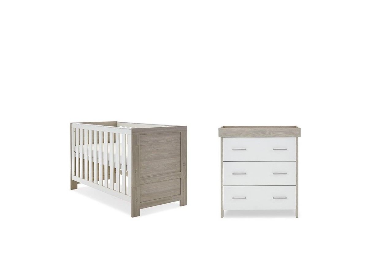 "The Obaby Nika range offers a contemporary design, due to its clean lines and textured oak effect finish, that will fit perfectly in today’s modern nursery. This 2 piece room set consists of Nika cot bed and changing unit.
