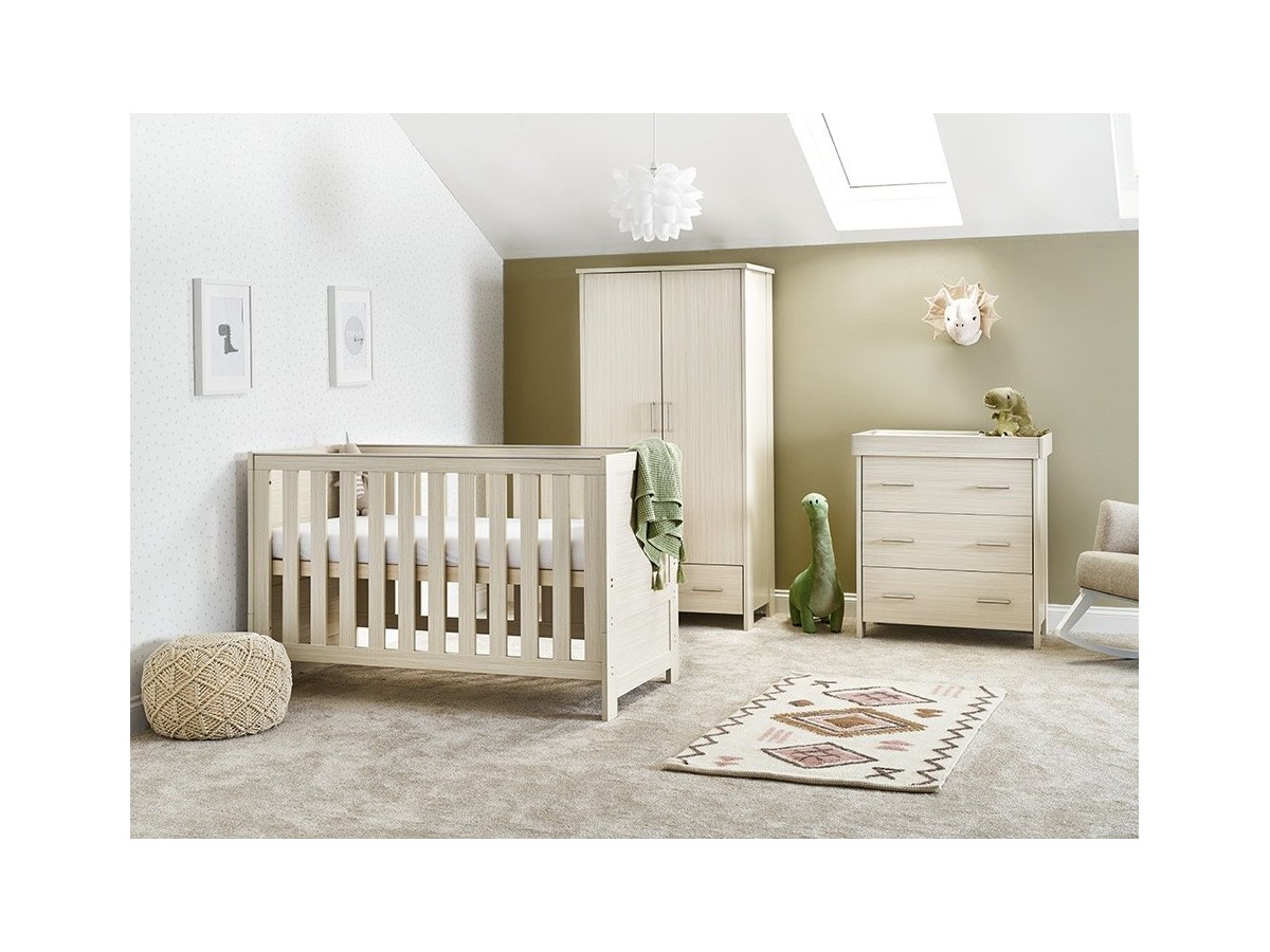 "The Obaby Nika range offers a contemporary design, due to its clean lines and textured oak effect finish, that will fit perfectly in today’s modern nursery. This 3 piece room set consists of Nika cot bed, changing unit and double wardrobe.