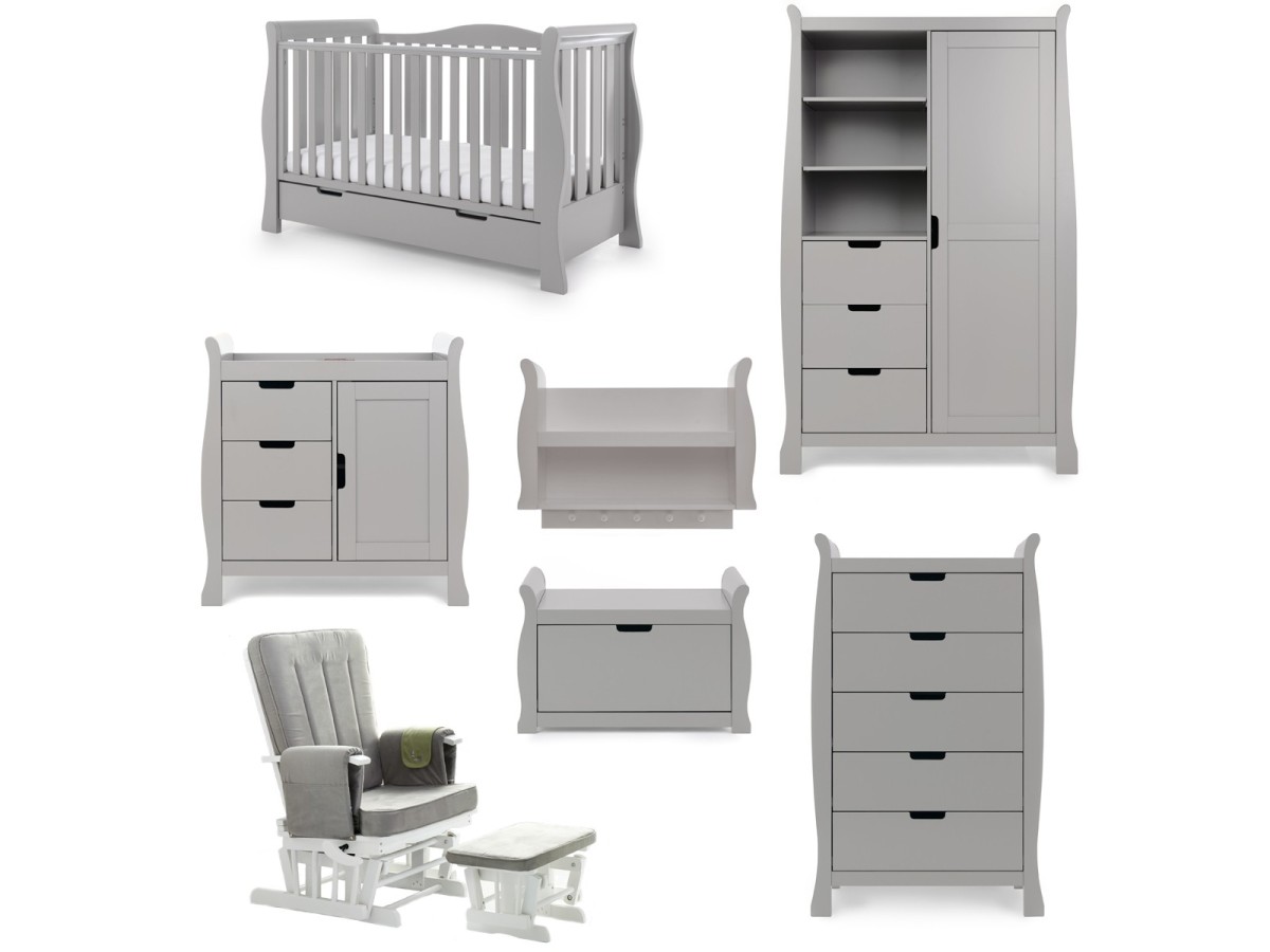 The Stamford Luxe 7 piece room set consists of the beautiful Stamford Luxe cot bed with under drawer, closed changing unit, double wardrobe, tall chest of drawers, toy box, shelf and deluxe reclining glider chair