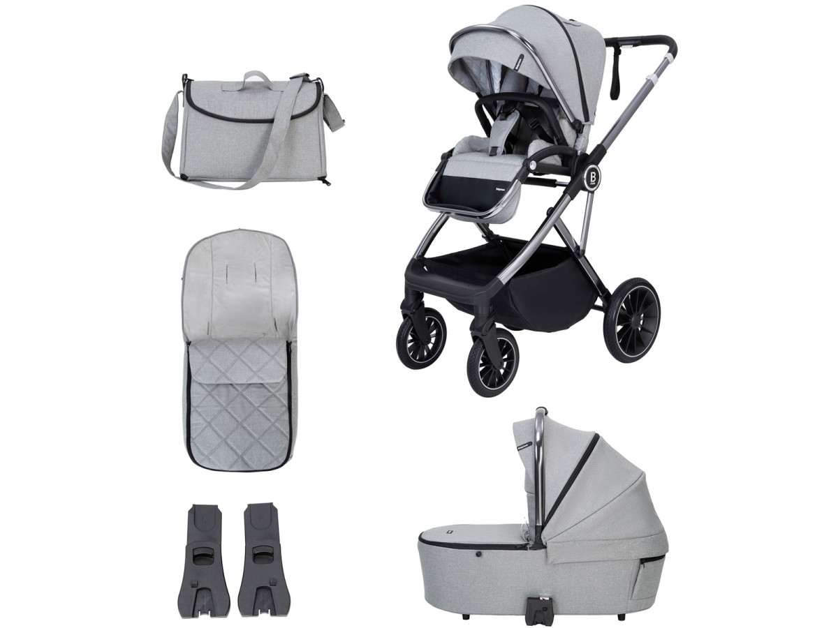 - Includes chassis frame, carrycot, seat unit, car seat adaptors, footmuff, changing bag and raincover