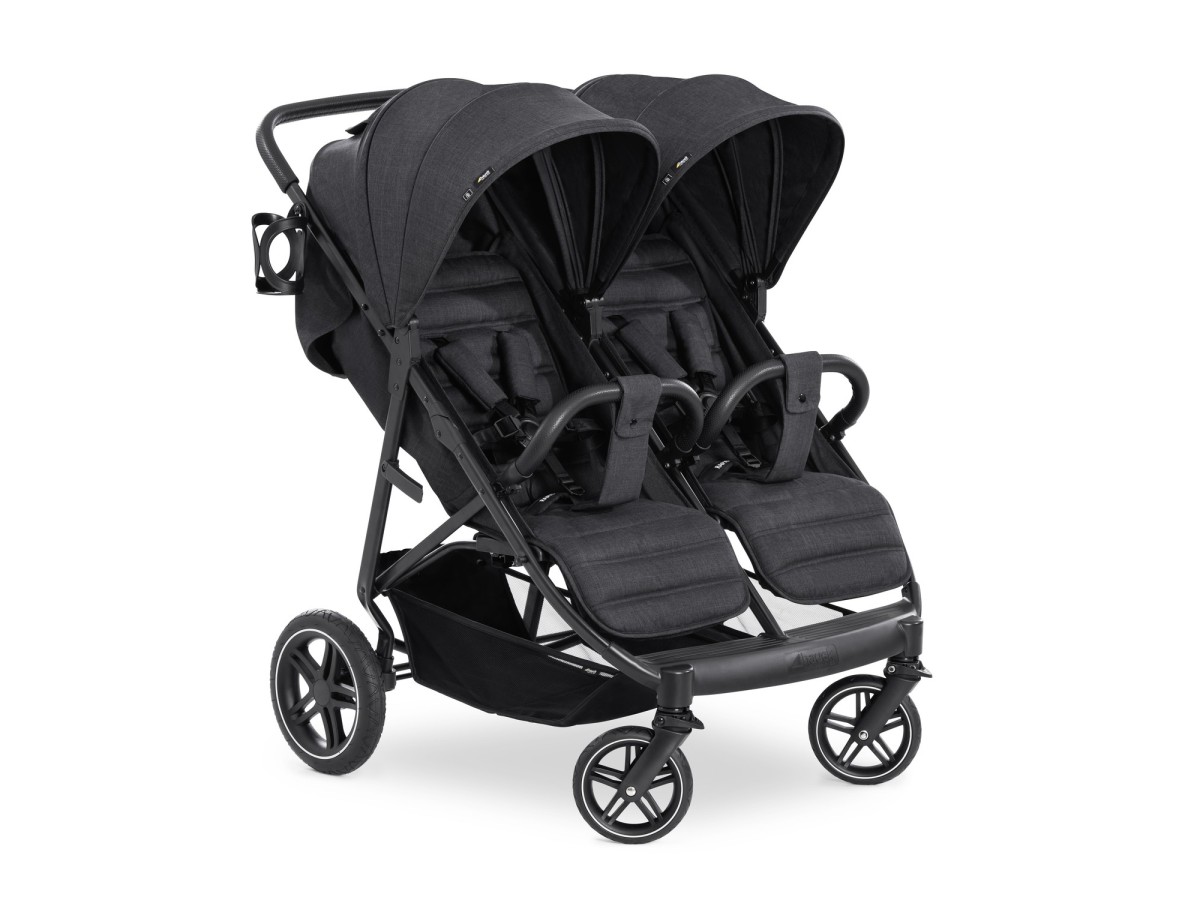 The two 5-point harnesses and padded bumper bars with anti-slip protection and the parking brake help keep your children safe at all times. Toys, purchases and food can be stored in the large shopping baskets, while your drink is right at hand in the practical cup holder.